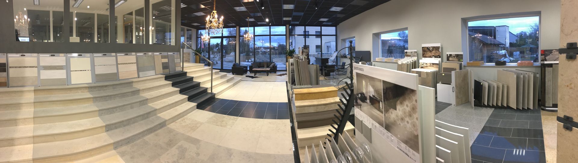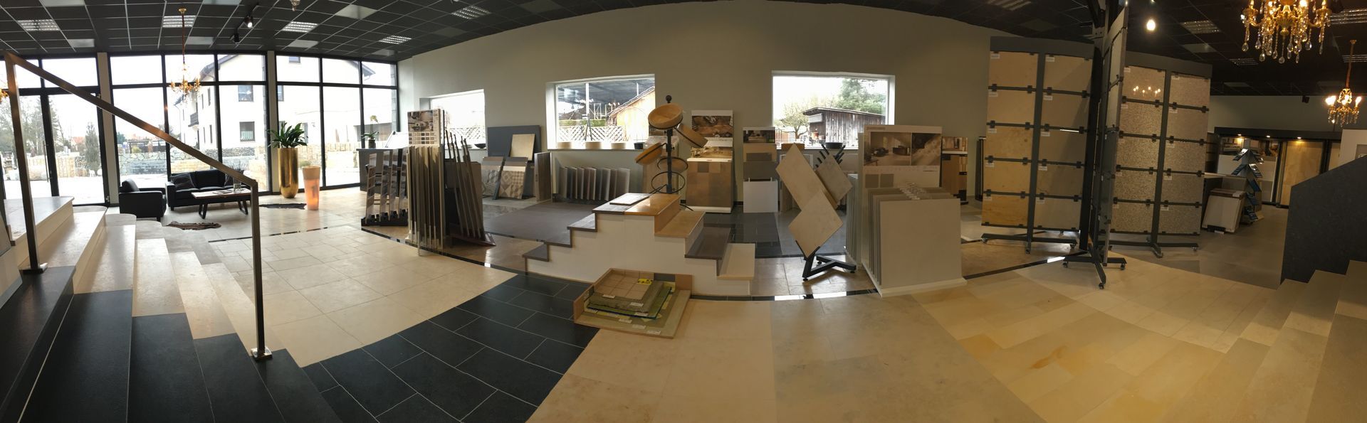 Wir bieten Ihnen in unserem ca. 15000 m² großen Lager und ca. 5000 m² großen Ausstellung eine sehr große Auswahl an Natursteinen, Feinsteinzeug, Fliesen, Öfen und auch Baustoffen.